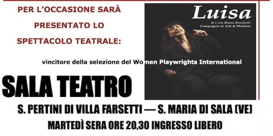 Piccolo centro, grande partecipazione. Gli amici Elena e Massimo (che aderiscono alla community) della Gardin Piante organizzano una raccolta fondi per il Centro Antiviolenza di Mestre e un aperitivo di sensibilizzazione, sabato 22 e domenica 23 in via Caltana 114. Dress code rosa, ok, ma anche i maschi lo portano benissimo. Massimo partecipa anche all'iniziativa del Comune di S. Maria di Sala, che promuove NoiNo.org chiedendo ai cittadini di aderire alla community e di esporre un drappo rosso alle finestre. Martedì 25 alle 20.30, spettacolo teatrale "Luisa" di e con Bruna Braidotti, vincitore della selezione del Women playwrights international. Sala teatro Pertini di Villa Farsetti, ingresso libero. Per info: tel. 041 487550, e-mail info.eventi@comune-santamariadisala.it.