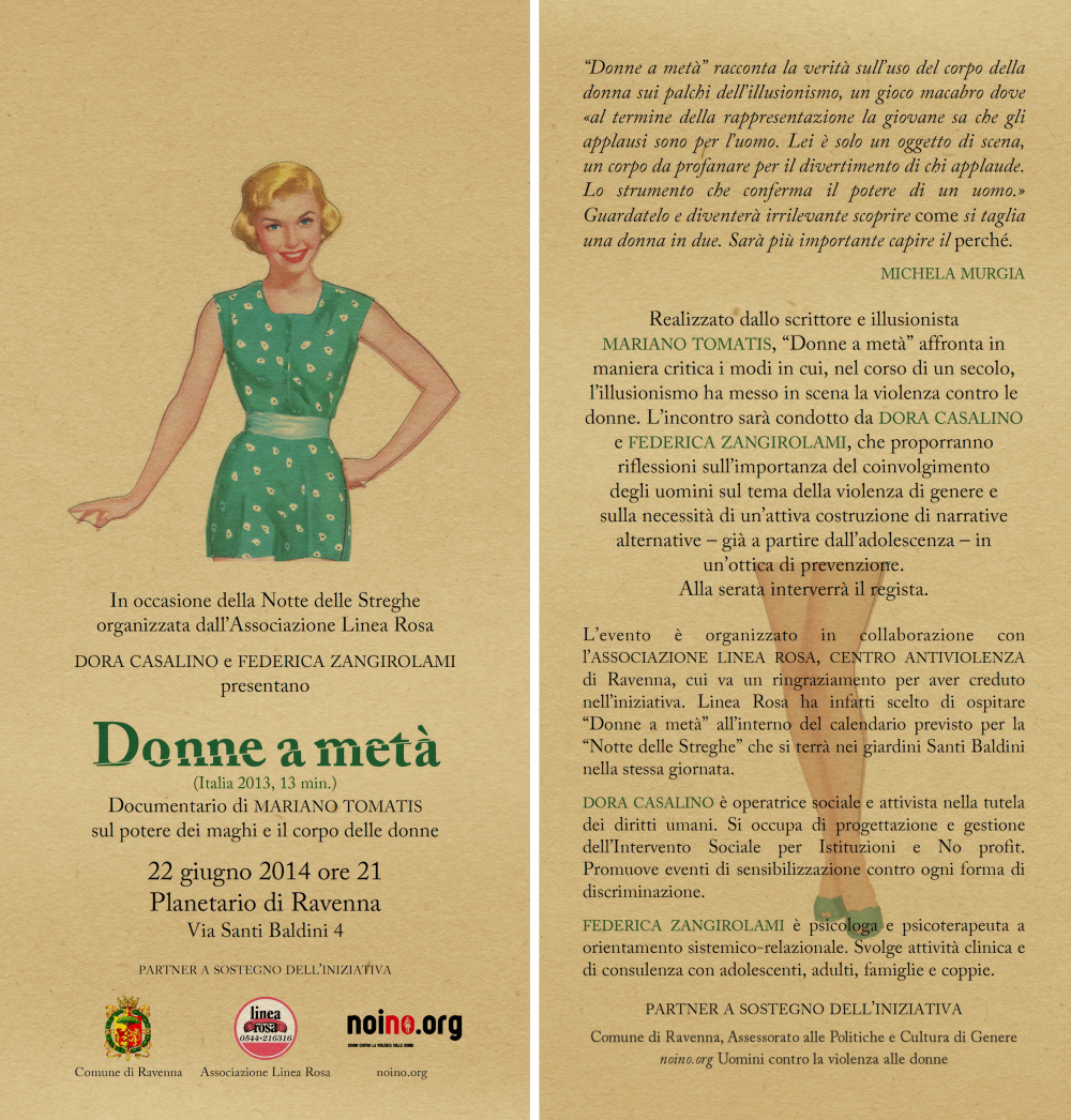 Vi abbiamo già parlato di "Donne a metà", documentario sull'illusionismo come mezzo per svelare il profondo sessismo della nostra cultura. Il 22 giugno a Ravenna potrete vederlo proiettato sotto le stelle (artificiali) del Planetario, e presentato dallo stesso autore. Mariano Tomatis non è solo un esperto di "magia", ma passa dall'applicazione dell'informatica alla cattura di serial killer (il video della sua lezione è su YouTube) alla collaborazioni con gli scrittori Wu Ming (L'armata dei sonnambuli). E in più aderisce alla community NoiNo.org (e voi?).