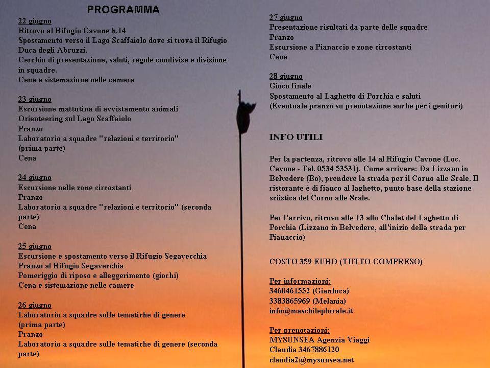 Il campo è rivolto a ragazzi e ragazze dai 15 ai 18 anni. È un campo "sperimentale" in cui si fonderanno i temi dell'educazione ambientale e quelli dell'educazione al genere. Ci saranno quindi, come sempre nei campi della Coop. Madreselva, momenti di avventura e di conoscenza della natura e del territorio montano, e ci sarà, come sempre nelle esperienze didattiche di Maschile Plurale, l'attenzione alle relazioni di genere, alle storie, ai racconti in cui si mettono in gioco i modelli del maschile e del femminile.