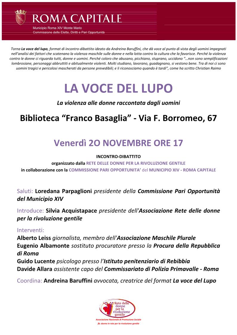 A Roma si fa sentire La voce del lupo - la violenza alle donne raccontata dagli uomini. Venerdì 20 alle 17, alla biblioteca F. Basaglia di via F. Borromeo, 67: proiezioni della web serie Five Men, interventi di alcuni studenti e di rappresentanti di Maschile Plurale. Si replica a Napoli con altri relatori sabato 21 alle 11, nella sala della municipalità di Piazza Dante.